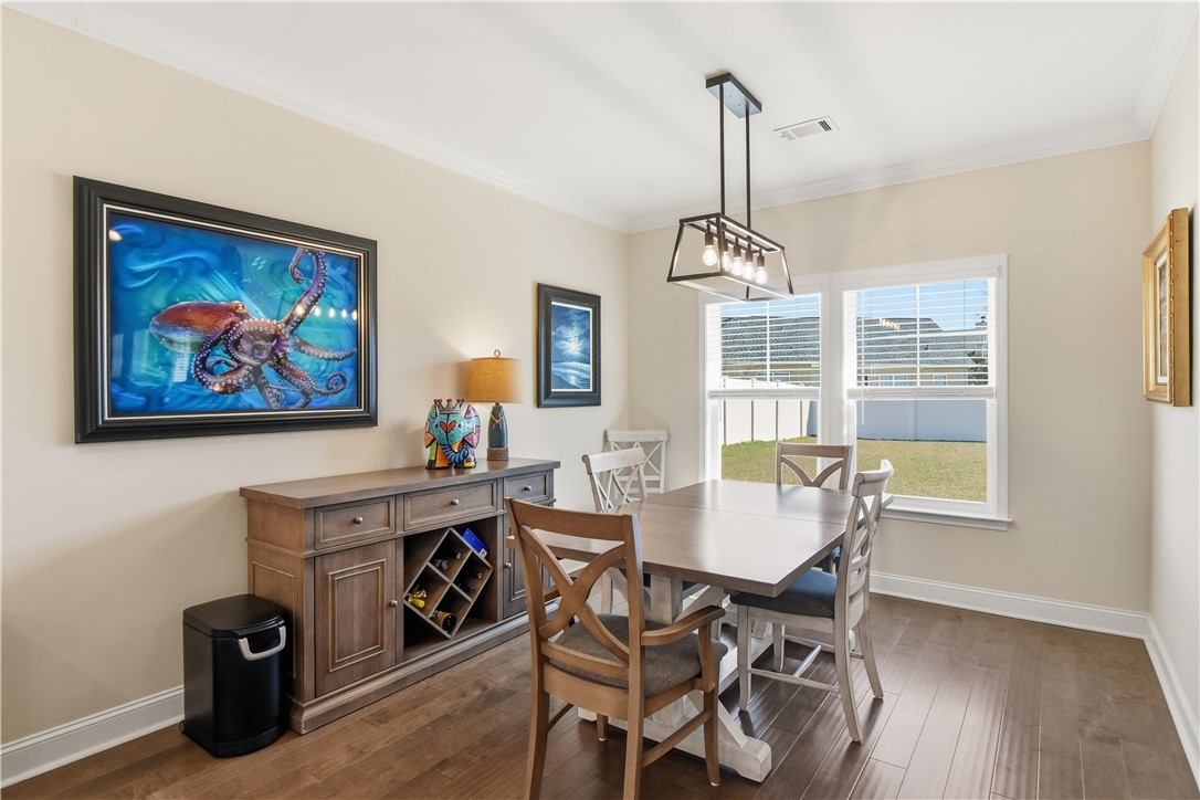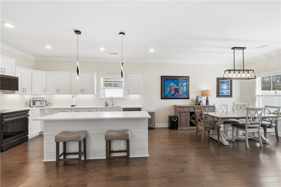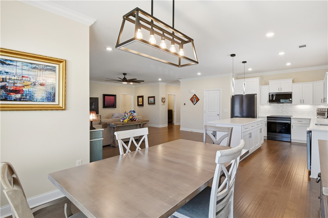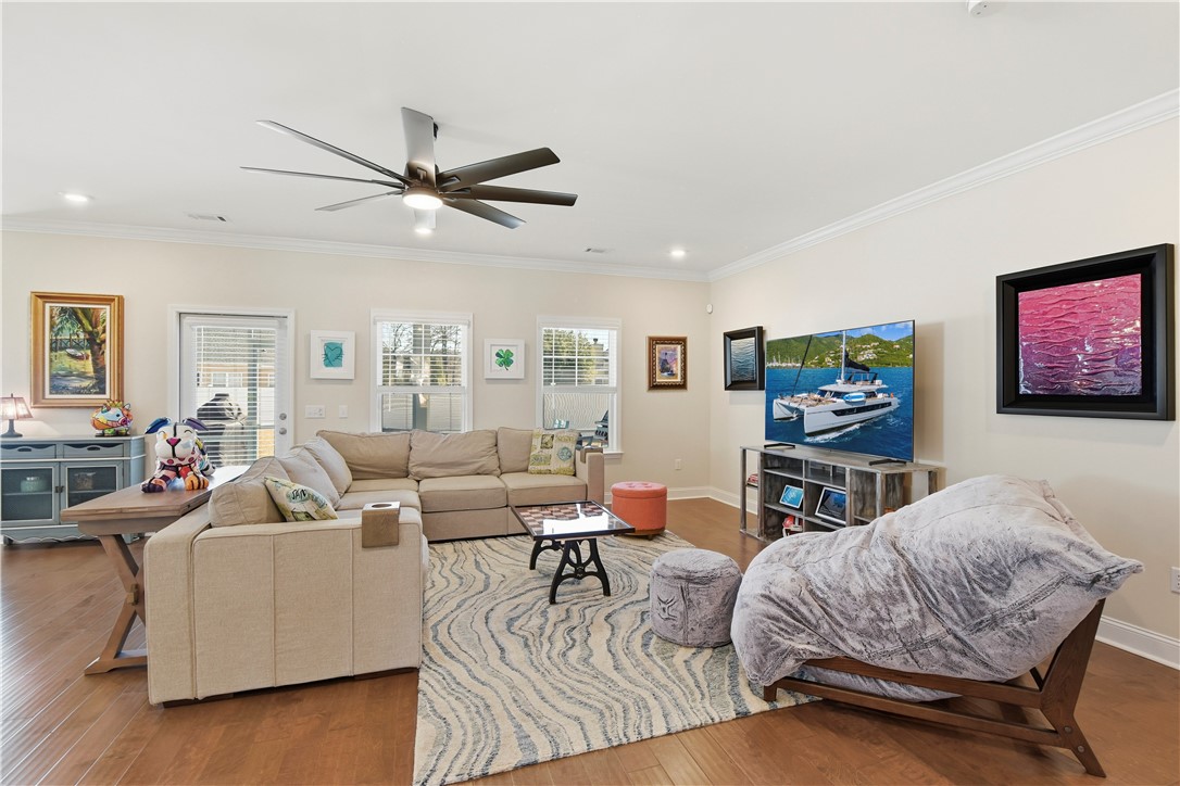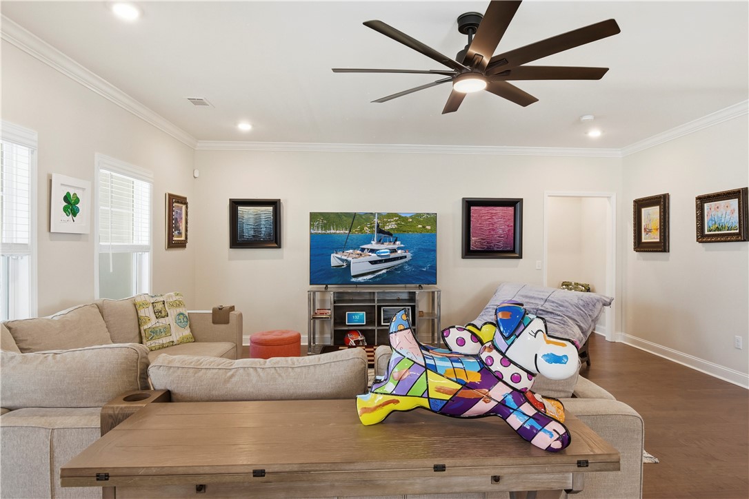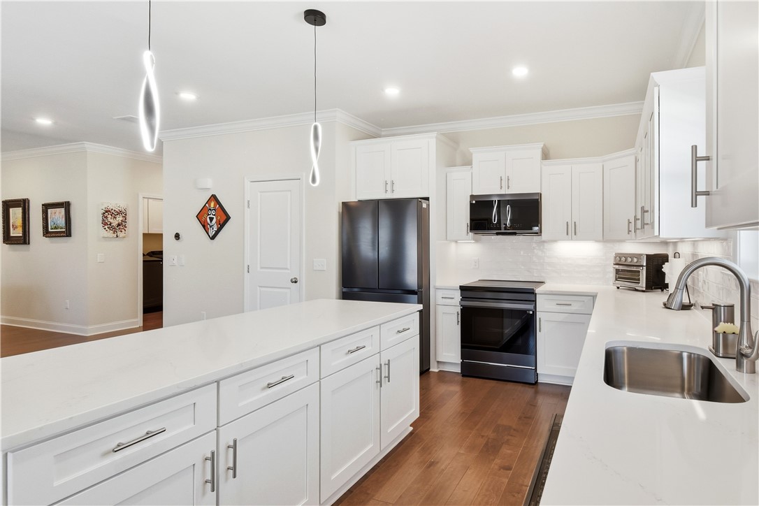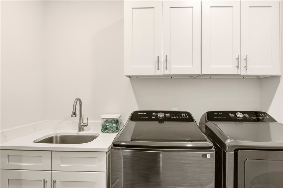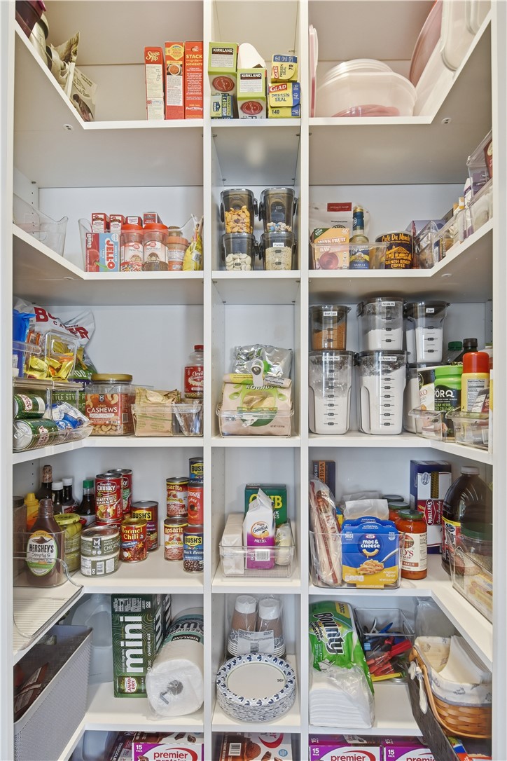 The kitchen stands out with Samsung appliances, induction range, quartz countertops, soft-close cabinetry, crown molding, abundant cabinet storage, and a custom-built pantry designed for maximum organization.