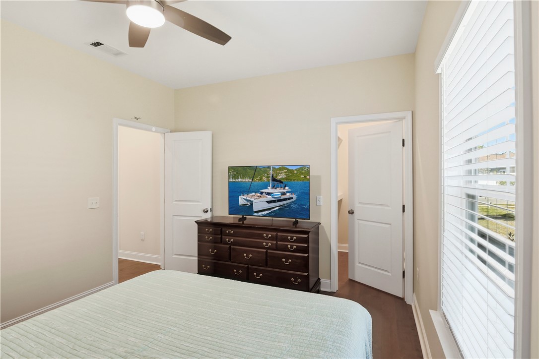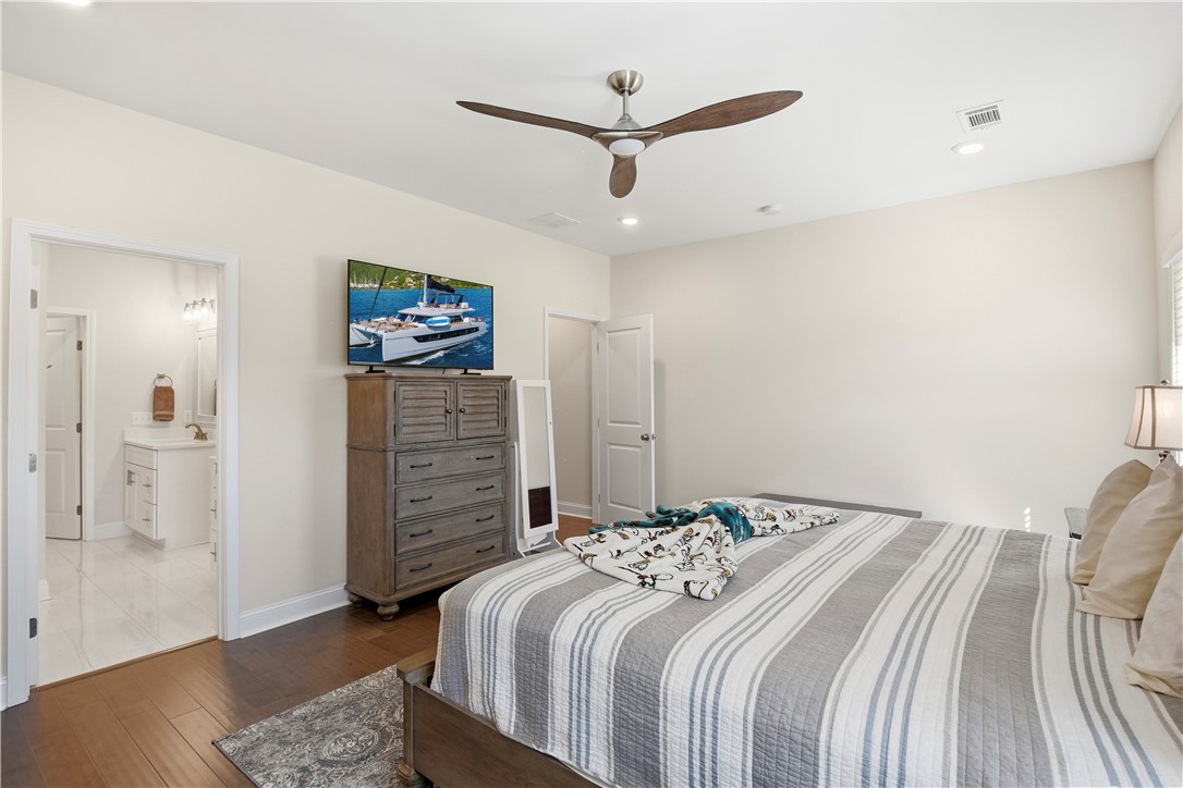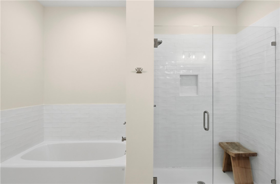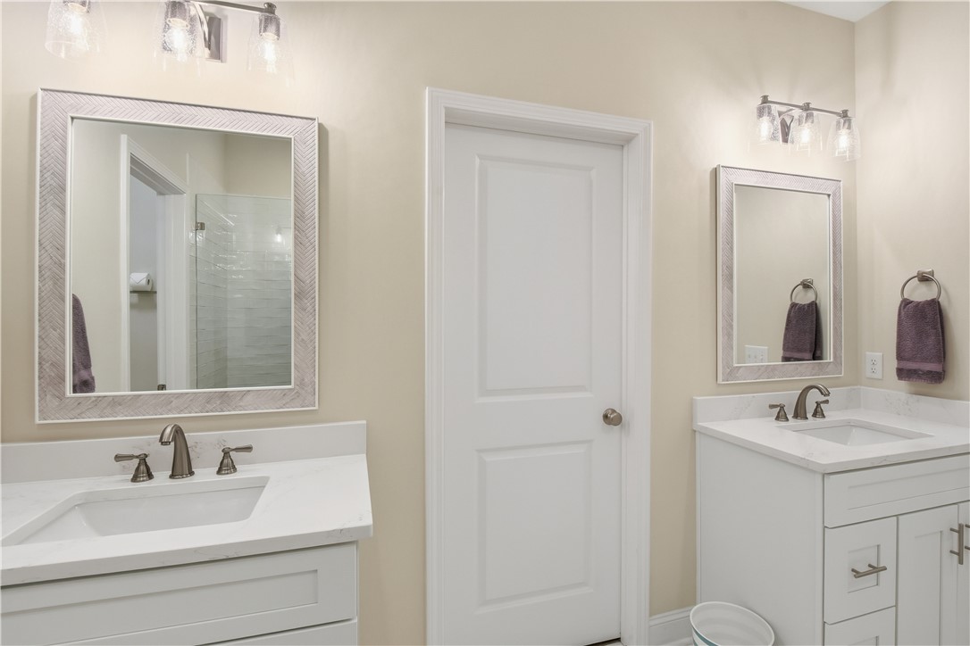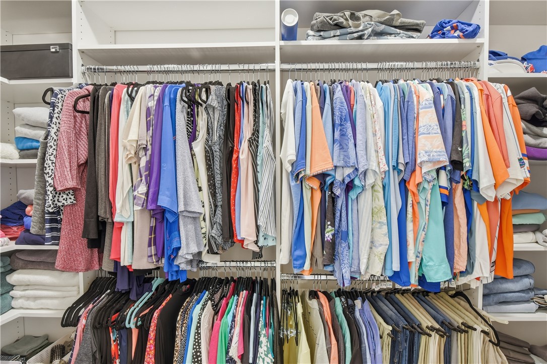 The layout delivers flexibility and privacy. The primary suite features a walk-in shower, separate soaking tub, private water closet, double vanities, and custom-designed closet. A secondary bedroom includes its own en-suite bath -- ideal for guests or extended family. Two additional bedrooms share a well-appointed hall bath, and every bedroom offers a walk-in closet for exceptional storage. A convenient half bath serves the main living areas.